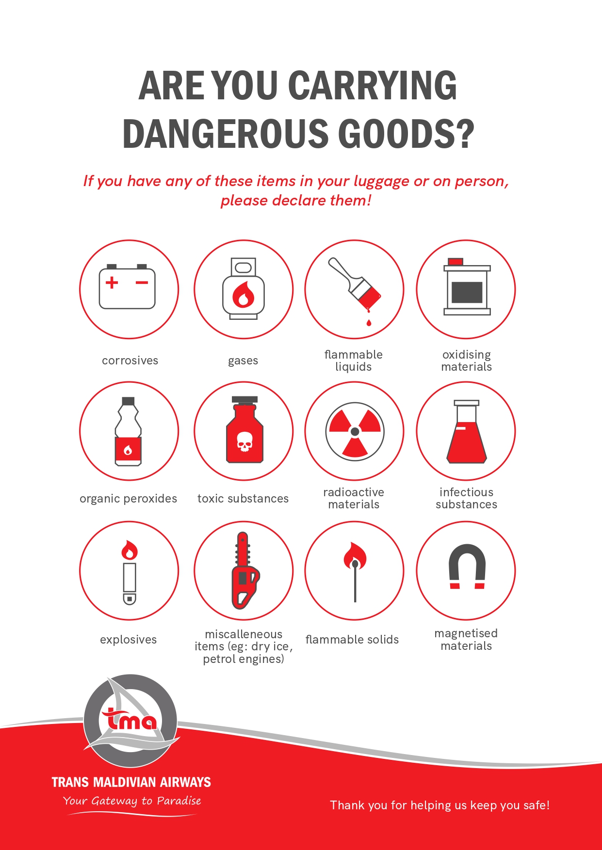 All dangerous goods policies followed by Trans Maldivian Airways are based on the International Air Transport Association (IATA) Dangerous Goods Regulations and the applicable regulations issued by the Civil Aviation Authority of Maldives.