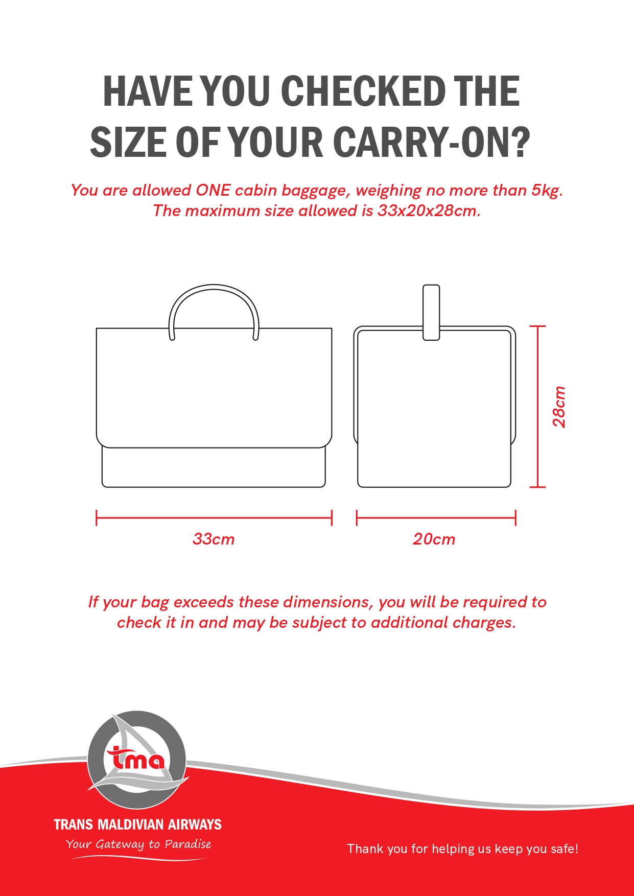 Kindly review the guidelines below to ensure that all items carried in both checked baggage and cabin baggage do comply with the applicable aviation safety regulations and the specified baggage dimension limits.