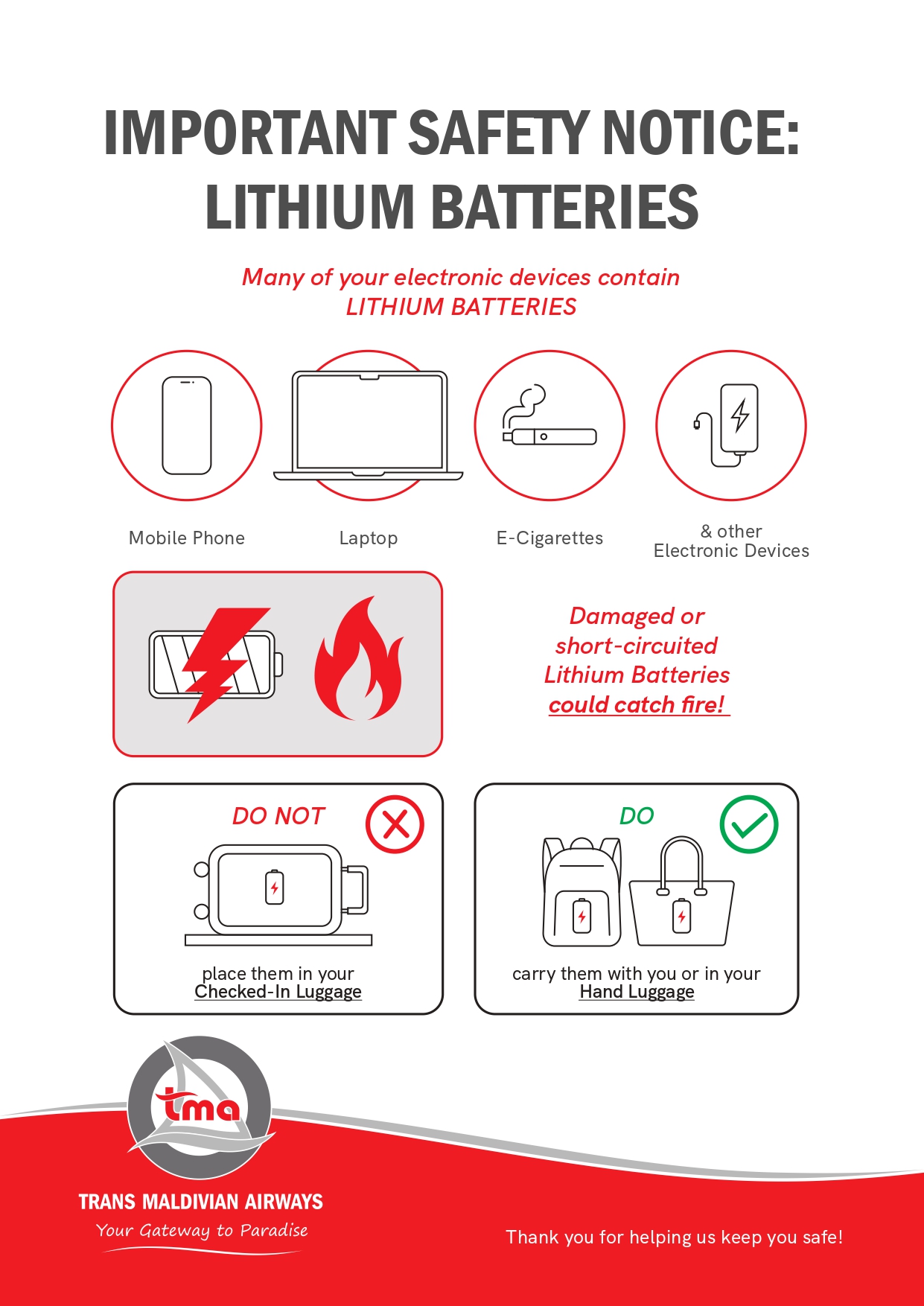 For the safety of all guests and crew, certain items are restricted or regulated on flights operated by Trans Maldivian Airways. These restrictions include the carriage of dangerous goods, specific conditions for transporting lithium batteries, and limitations on the size of cabin baggage.